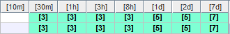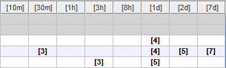 Las otras columnas cubren intervalos de interrupción. Solamente los activos pueden recibir valores; las otras filas están muertas.