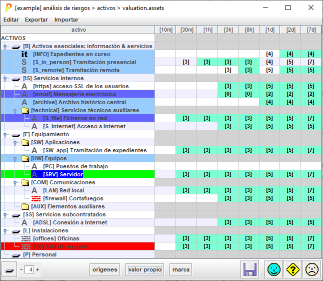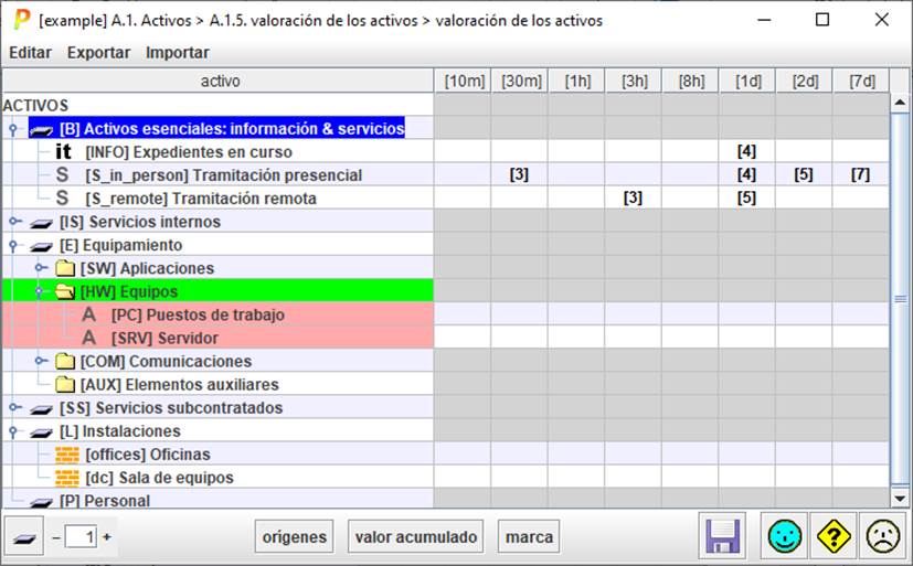 Repita los pasos anteriores con la demás preocupaciones en orden decreciente hasta que considere que el resto de asuntos no son tan importantes. Haga clic en ACUMULADO para estudiar la propagación del valor de los activos superiores hacia los inferiores. Conviene realizar una comprobación de que cada activo tiene un valor con sentido. |