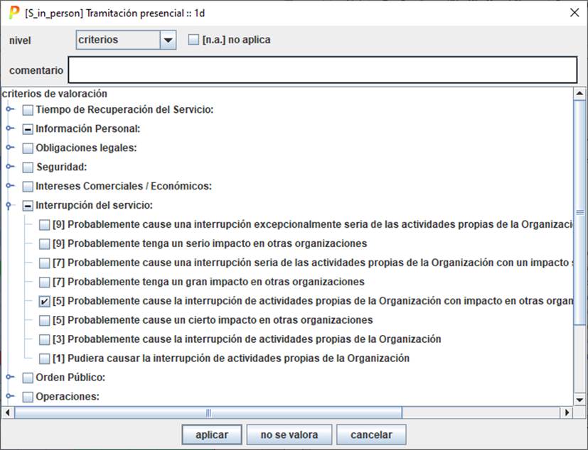 Si selecciona “CRITERIOS”, el valor lo decide la marca de mayor valor de los criterios marcados en el panel. Si selecciona un nivel, este será el asignado al activo, independientemente de los criterios marcados. |
