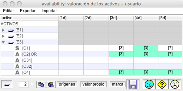 El siguiente ejemplo muestra cómo los equipos redundantes C31 y C32 no se valoran en disponibilidad, mientras que el activo común, C4, recupera el valor. Nótese que otras dimensiones no se ven afectadas por la calificación como OR.