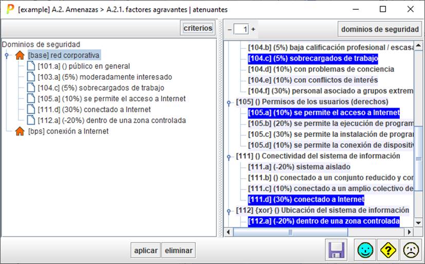 Seleccione un criterio a la derecha. Haga clic en DOMINIOS DE SEGURIDAD. PILAR selecciona a la izquierda los dominios a los que se aplica el criterio. |