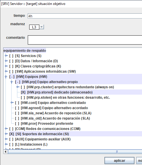 Haciendo clic-clic o haciendo clic con el botón derecho, pasará a una ventana donde puede introducir o modificar la información relativa al equipamiento de respaldo.