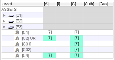 The following example shows how the redundant equipment C31 and C32 are not valued in availability, while the common asset, C4, recovers value. Note that other dimensions are not affected by classification as OR.