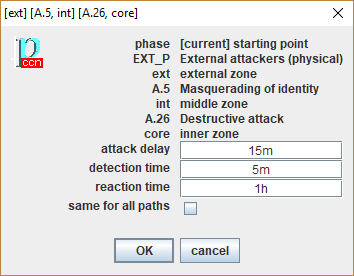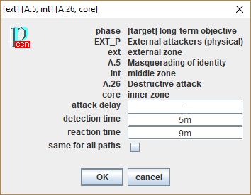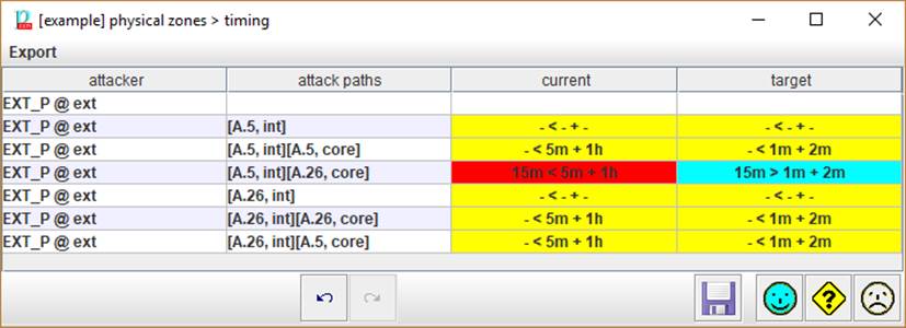 Let’s see an example. There are 3 zones: external, intermediate, and internal. There is an external attacker that tries to get inside. The attacker requires 10 minutes. The border systems take 5 min to detect, and reaction requires 1 hour.