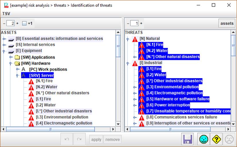 — Select one or more threats in the right panel. — Click ASSETS. PILAR selects on the left panel, the assets that are associated to the selected threats. |