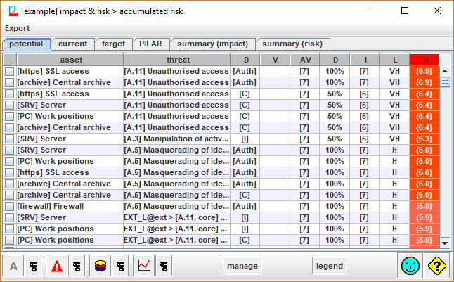 For the rows selected in column 1, PILAR collects the risks, and jumps to the safeguard valuation screen, only taking into account the selected risks. |