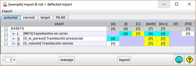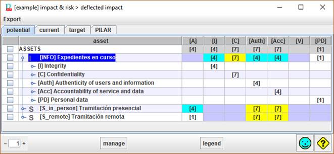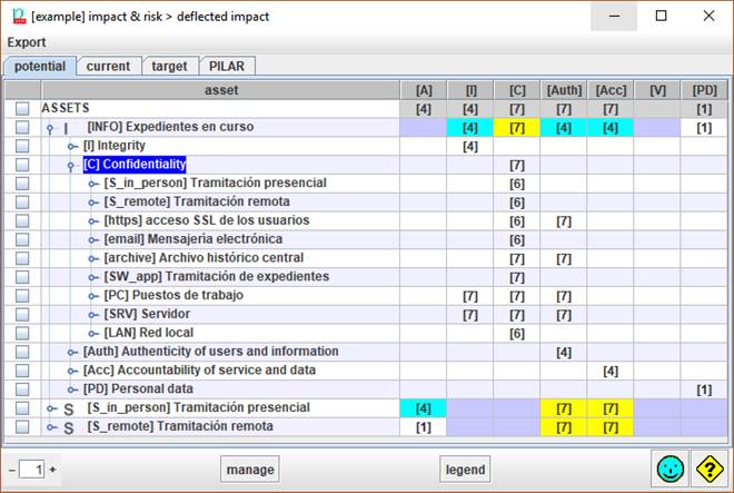 Assets tree. 1st level: assets with a value: deflected impact. 2nd level: split down of security dimensions: deflected impact. 3rd level: assets below (in dependency tree): accumulated impact. 4th level: threats impacting the assets: accumulated impact. |