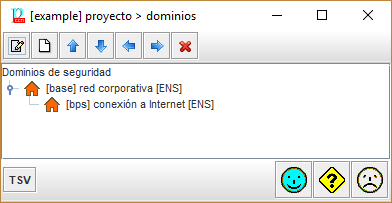 Esta pantalla permite establecer y gestionar la jerarquía de dominios. Siempre existe un dominio BASE, que no se puede eliminar. Los activos que no están adscritos a ningún dominio específico, caen en la BASE.
