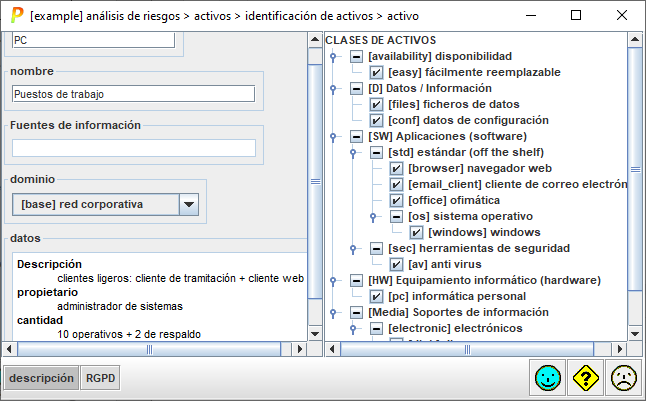 Puede activar o inhibir un activo. Si no existe, se ignora a efectos del análisis de riesgos te |