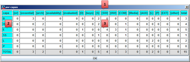 Cada columna cubre una de las clases de activos. Por ejemplo, [1] cubre la clase [SW]. En la columna [1] hay 3 [3] activos con clases bajo [SW], todos ellos en la capa E [2].