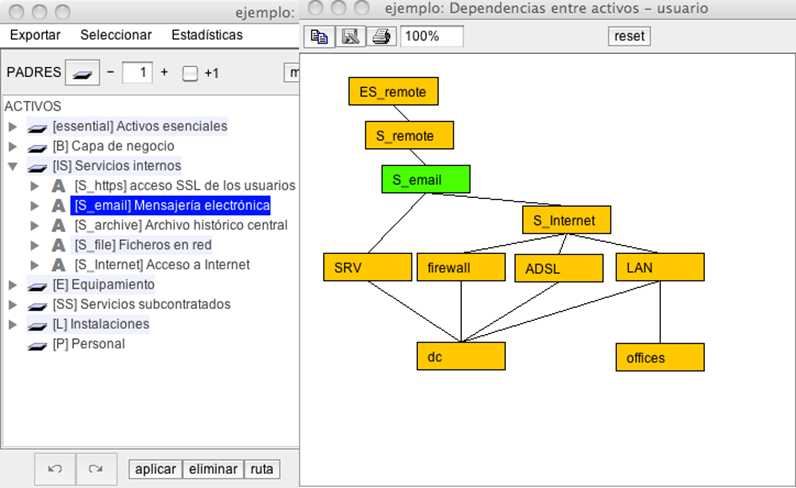 PILAR aplica una serie de heurísticos para ubicar los activos de forma que se respete lo más posible la estructura de capas, pero que en ningún momento un activo "superior" esté por debajo de un activo "inferior". De esta forma todas las dependencias van de arriba a abajo. Sin embargo, si el gráfico no es agradable, el usuario puede recolocar los activos según desee (use el ratón para seleccionar y llevar a otra posición.).