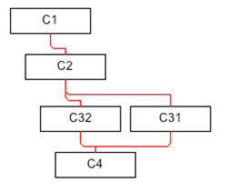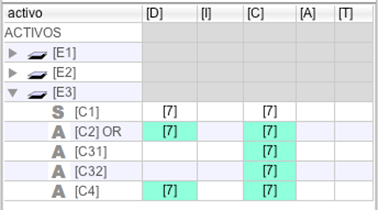 El siguiente ejemplo muestra cómo los equipos redundantes C31 y C32 no se valoran en disponibilidad, mientras que el activo común, C4, recupera el valor. Nótese que otras dimensiones no se ven afectadas por la calificación como OR.