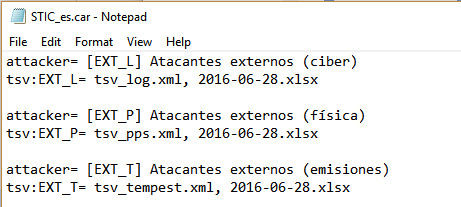 Para un atacante lógico como es EXT_L, su capacidad de ataque sobre los elementos de frontera lógica se definen en el fichero tsv_log.xml. Una vez dentro, su capacidad de ataque es la descrita en 2016-06-28.xlsx.