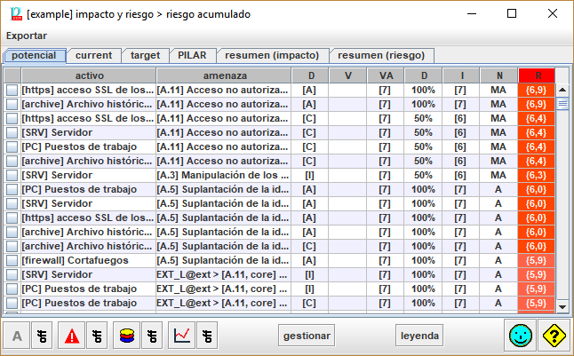 Para las filas seleccionadas en la columna 1, PILAR recolecta los riesgos asociados y salta a la ventana de valoración de salvaguardas, teniendo en cuenta solo dichos riesgos. |