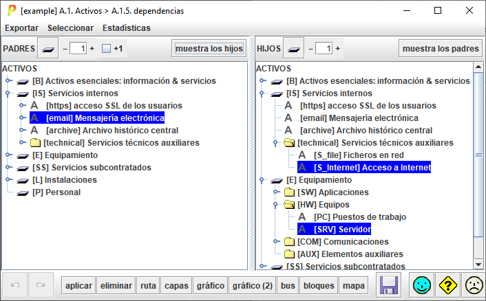 Seleccione un activo en el árbol izquierdo. Haga clic en MOSTRAR LOS HIJOS. PILAR seleccionará a la derecha los activos de los que depende directa e indirectamente. |